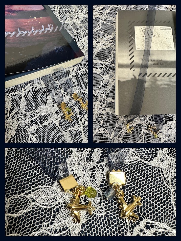厚めなので栞を付属させたくて、飛行機チャームを探してリボンタイプのブックマーカーにしたよ✈