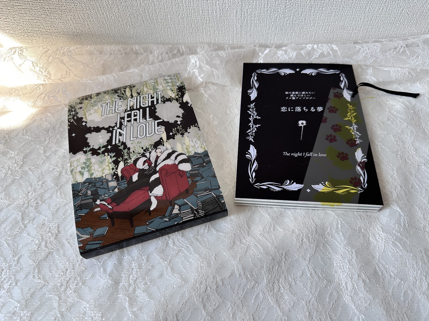 装丁 番外編 弐十八:恋に落ちる夜 クル監 #twst 秋の夜長に読みたい・読んで欲しいアンソロジーをテーマとした物語で、装丁にもこだわった主催アンソロですクリアカバー+クリアしおり付きで表紙:ディープマット ルージュ+白印刷遊び紙:アートドリープ - リズム本文に交互でモノクロの枠をつけることで、しましま風の小口に